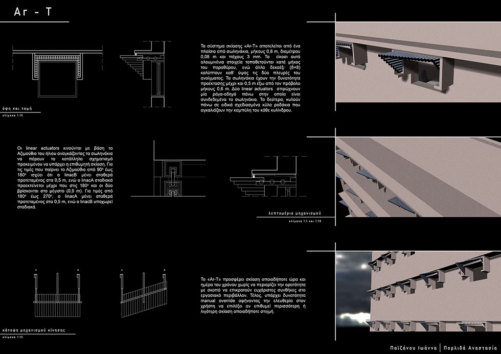 The "Ar-T" shading system consists of a frame of tubes, 0.8m long, 0.08m in diameter and 3mm thick. These twenty aluminum elements are placed along the top frame of the window, while another sixteen (8+8) cover both sides of the opening. The pipes have the possibility of extending up to 0.5m outside the 0.6m long cantilever. Two linear actuators push a guide rail onto which the tubes are attached. The second ones roll on specially designed roller wheels that embrace the curve of each cylinder.