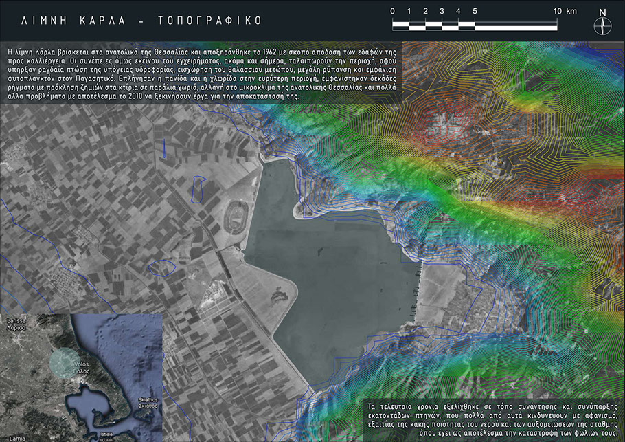 Lake Karla is located in the east of Thessaly and was drained in 1962 in order to cultivate the land. However, the consequences of that project, even today, are affecting the area, since there was a rapid drop in the underground aquifer, intrusion of the sea front, great pollution and the appearance of phytoplankton in Pagasitikos. Fauna and flora in the wider area were affected, dozens of cracks appeared causing damage to buildings in coastal villages, a change in the microclimate of eastern Thessaly and many other problems as a result of which, in 2010, projects for its restoration began. In recent years, it has developed into a meeting place and coexistence of hundreds of birds, many of which are in danger of extinction, due to the poor quality of the water and the fluctuations in the water level, resulting in the destruction of their nests. (poster 01 translation)