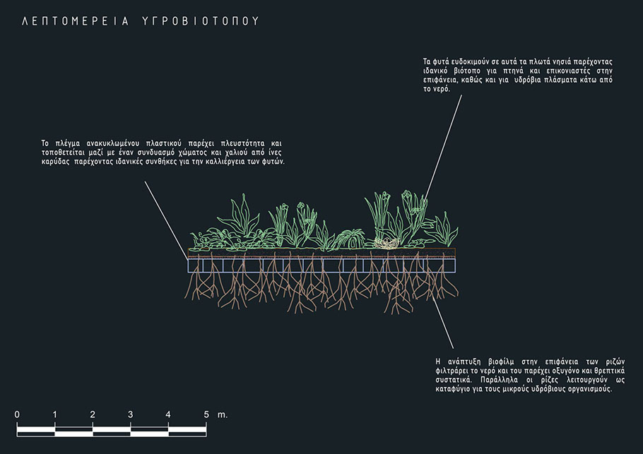 The project attempts to solve these problems by creating artificial wetlands on a floating grid made of recycled plastic. Pieces of wetland are grown tied to jetties and then are let to float on the lake or even moved out of it. It aims at researchers, farmers and visitors. It is a complex of facilities of 5 jetties with wetland cultivation capability, 4 wharves and 16 offices/laboratories, warehouse, lodgings and kitchen/dining buildings.